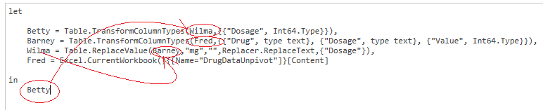 letFred = Excel.CurrentWorkbook(){[Name="DrugDataUnpivot"]}[Content],Barney = Table.TransformColumnTypes(Fred,{{"Drug", type text}, {"Dosage", type text}, {"Value", Int64.Type}}),Wilma = Table.ReplaceValue(Barney,"mg","",Replacer.ReplaceText,{"Dosage"}),inbetty =="" table.transformcolumntypes(wilma,{{"dosage",="" int64.type}})Betty